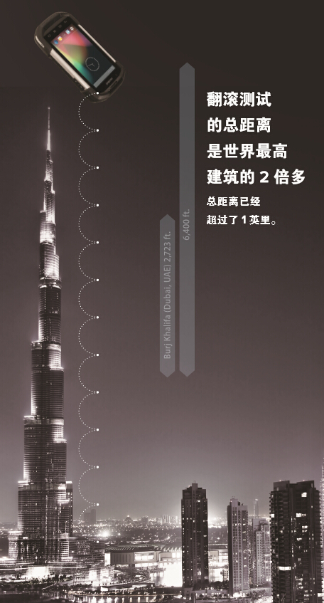 即使經(jīng)受了 2,000 次從 3.2 英尺/1 米高處連續(xù)翻滾(總距離為 6,400 英尺,這個距離是 2,723 英尺高的迪拜塔的 2 倍多) 的沖擊,TC70 依然可以可靠運行。