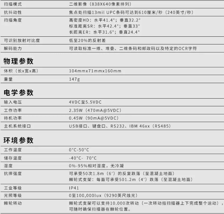 處于耐用性的考慮,Xenon 1900可以承受從1.8米高的地方到混凝土地面的50次反復跌落。IP41工業(yè)等級也為產(chǎn)品提供額外的保護。結實的構造確保Xenon 1900可以實現(xiàn)多年無間斷操作的卓越性能。