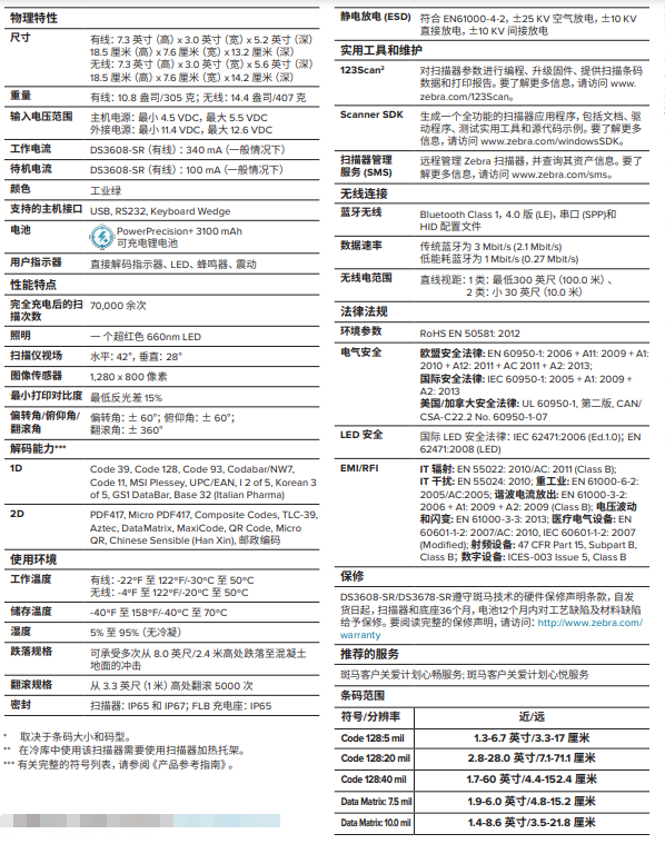 為了保證產(chǎn)品質(zhì)量,及時交付訂單,您的倉庫和生產(chǎn)車間的員工們每天要掃描成千上萬個條碼。這些員工的工作效率完全取決于您為他們購買的掃描器的質(zhì)量。如果您的員工需要采集標(biāo)準(zhǔn)范圍的 1D 和 2D 條碼,您可以為他們配備有線的 DS3608-SR 和無線的 DS3678-SR 掃描器,這兩款掃描器均采用了無與倫比的耐用性設(shè)計,擁有卓越的掃描性能和卓越的可管理性,無疑將成為您員工手中所向披靡的利器。先進(jìn)的掃描儀可以快如閃電地采集任何 1D 或 2D 條碼,無論這些條碼是標(biāo)簽(不管標(biāo)簽發(fā)生什么情況)條碼,還是屏幕條碼,從緊貼鏡頭到將近 5 英尺/1.5 米的范圍內(nèi),均可輕松采集。超耐用設(shè)計使這兩款產(chǎn)品可以在幾乎任何環(huán)境下應(yīng)用自如,尤其適合在惡劣環(huán)境下使用。DS3608-SR/DS3678-SR 的部署和管理都非常方便,可以大大節(jié)約時間。在無線技術(shù)方面,DS3678-SR 獨(dú)具特色,采用了一整套解決方案,包括密封的耐用型充電座,智能電池和斑馬技術(shù)自有的用于防止干擾 Wi-Fi 網(wǎng)絡(luò)的 Wi-Fi 友好模式。DS3608-SR/DS3678-SR — 具備您所需要的不間斷性能,可以全面提高員工的工作效率和產(chǎn)出量。