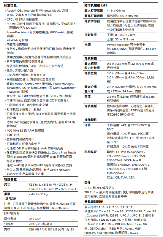 因打印機頻繁重啟導致工作效率降低的問題將不復存在。 不管任何時候,只要工作人員按下“打印”,ZQ630 即時可 用。這款智能打印機在閑置時進入睡眠模式,在用戶分配打 印任務時自動喚醒,確保即時可用并盡可能地提高電源效 率。與其他移動打印機不同的是,ZQ630 的即時喚醒功能 利用 Wi-Fi 和 Bluetooth 技術(shù)。