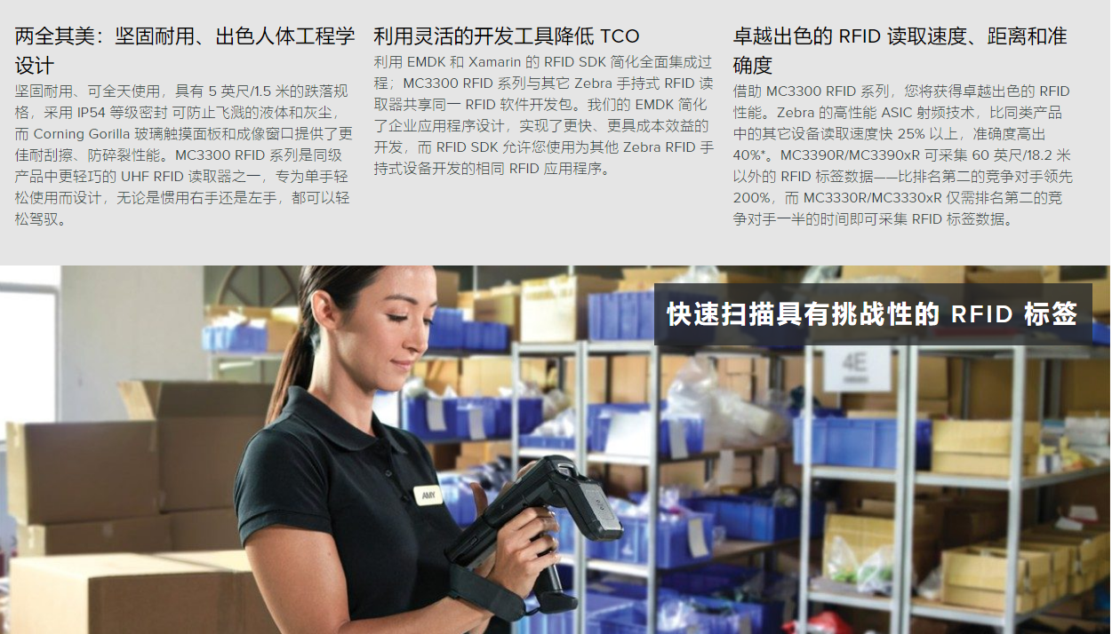 RFID 為庫存和資產(chǎn)管理、訂單履行等帶來了全新水準(zhǔn)的高效率。要更大限度地提高工作效率,您要為員工提供一種能為 RFID 應(yīng)用帶來更 佳舒適度、更高的任務(wù)速度、更好的易用性以及準(zhǔn)確性的設(shè)備。MC3330R 手持式 RFID 讀取器可以幫助解決這一切。您可獲得 Zebra 工業(yè) 手持式設(shè)備的標(biāo)志性耐用設(shè)計(jì),更大限度地確保設(shè)備正常的運(yùn)行時(shí)間。MC3330R 是同類設(shè)備中極為輕巧的設(shè)備之一,同時(shí)采取正確的人 體工程學(xué)設(shè)計(jì),可確保全天舒適使用。RFID 讀取性能和接收器靈敏度可快速、準(zhǔn)確地掃描極具挑戰(zhàn)性的 RFID 標(biāo)簽。員工可隨指隨 掃,輕松讀取 RFID 標(biāo)簽和條碼。而且,您可開發(fā)直觀的 Android 應(yīng)用程序,以充分利用 MC3330R 強(qiáng)大的計(jì)算平臺(tái)、寬大觸摸屏和物理鍵 盤。MC3330R — 手持式 RFID 讀取器的新一代發(fā)展方向。