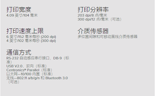 打印機(jī)能夠通過一系列標(biāo)準(zhǔn)特性應(yīng)對頗為嚴(yán)苛的應(yīng)用需求,包括并行,串行,USB和以太網(wǎng)連接;大容量內(nèi)存;以及Zebra變成語言。選項(xiàng)包括切紙器與剝離器,Bluetooth與Wi-Fi認(rèn)證通信以及高分辨率打印。